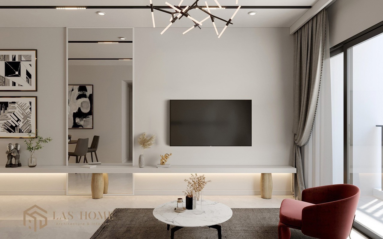 Không gian phòng khách được thiết kế tao nhã bằng tông màu trung tính với điểm nhấn là chiếc ghế đơn màu đỏ mang đến nét hiện đại, cá tính tới cho căn hộ của khách hàng.